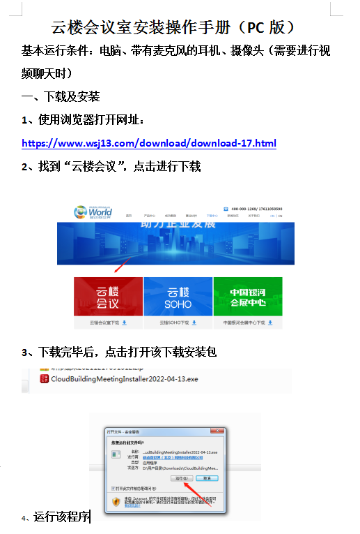 云楼视频会议电脑端下载地址: http://ceb.cspi.edu.cn/uploads/soft/pcyl.exe 云楼视频会议手机端下载地址: http://ceb.cspi.edu.cn/uploads/soft/yl.apk 云楼电脑端和手机安装包下载地址: http://ceb.cspi.edu.cn/uploads/soft/yl.rar