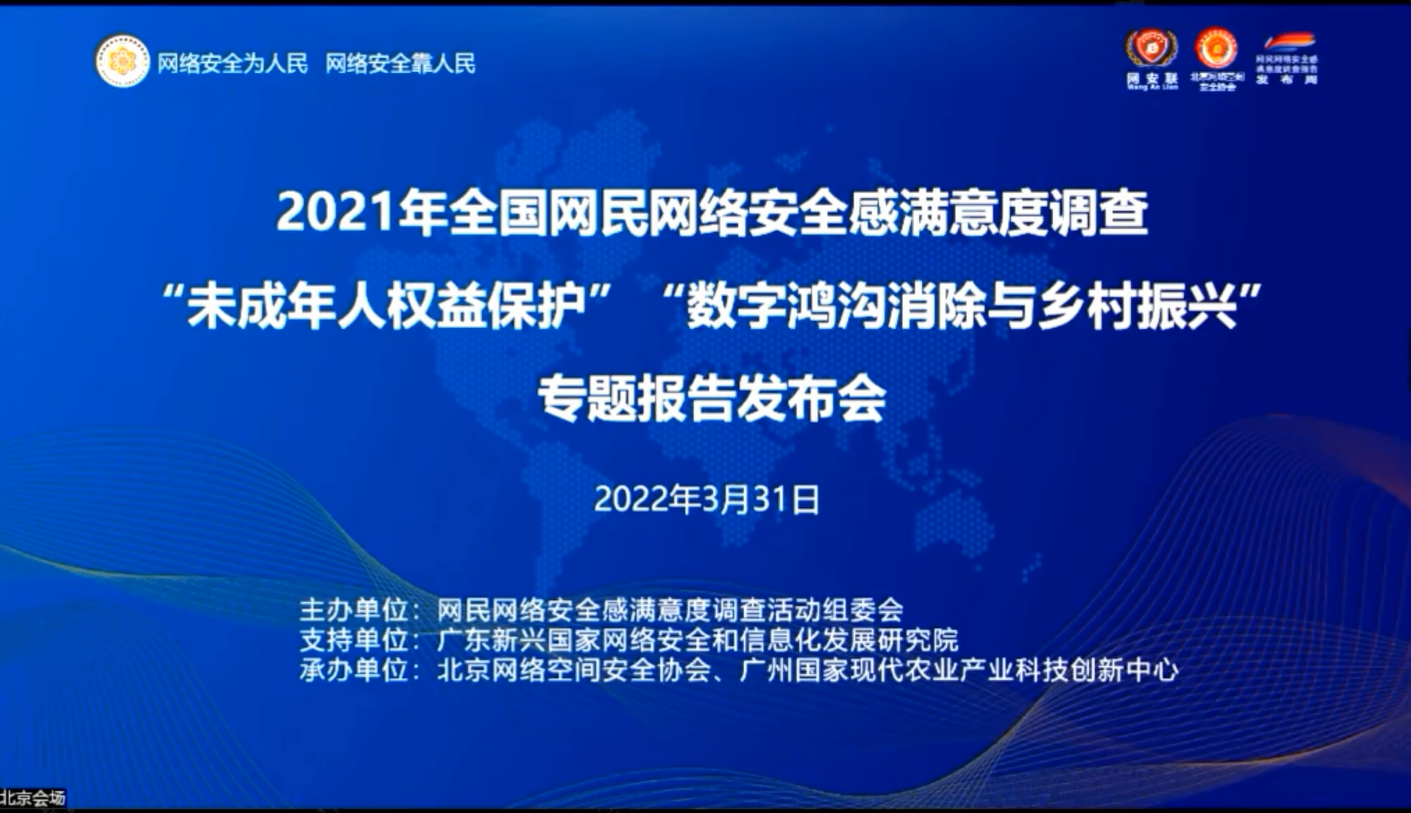 2022年3月31日上午9:00,由网民网络安全感满意度调查活动组委会主办的2021年全国网民网络安全感满意度调查专题报告发布会在线上召开,主题为“未成年人权益保护”及“数字鸿沟消除与乡村振兴”,我校网络与信息化中心组织收看了本次线上视频发布会。