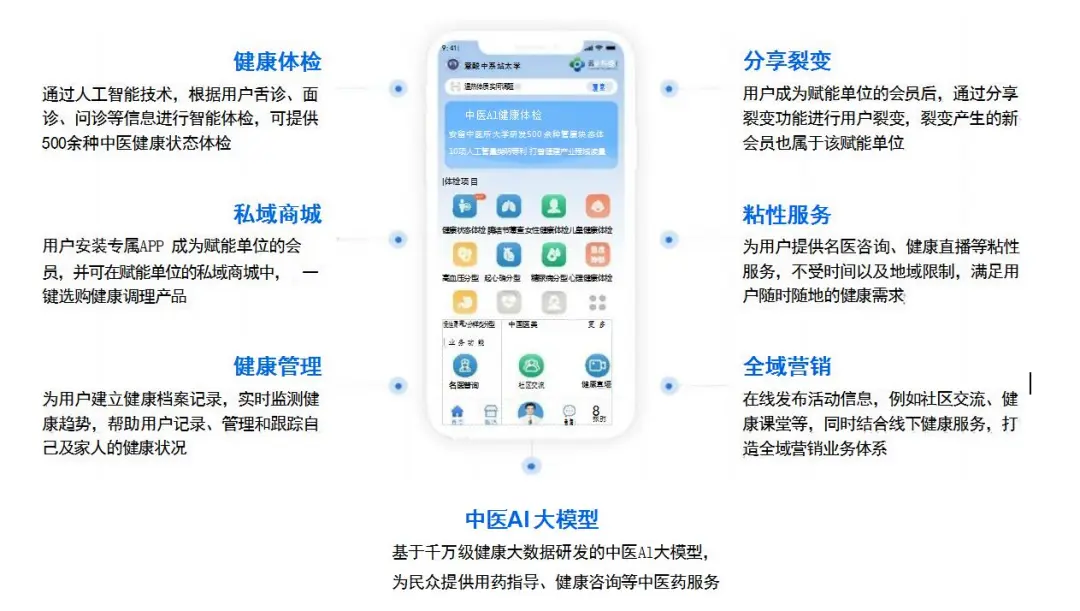 用户使用“云诊365”健康APP 拍摄并上传舌面、舌下、面部照片,结合智能问诊,10秒快速进行500余种健康状态体检,包括普通人群106种中医健康状态 、163种女性健康状态、47种儿童健康状态、百余种慢病分型与调理、30种焦虑、抑郁中医情志病等,并给出中医名医名方与经方等健康调理方案,结合名医咨询、私域商城、健康直播、粘性服务等业务体系,为连锁药店、制药企业、大健康产业赋能。