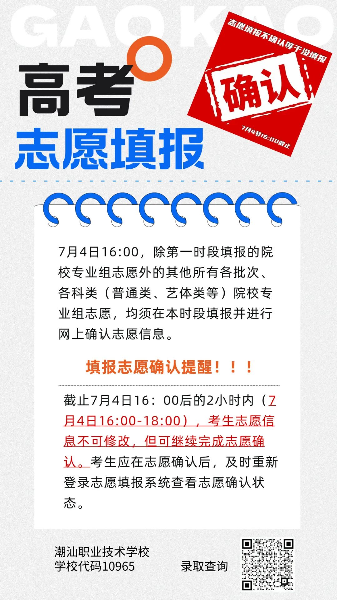 7月4日16:00,除第一时段填报的院校专业组志愿外的其他所有各批次、各科类(普通类、艺体类)院校专业组志愿,均须在本时段填报并进行网上确认志愿信息。