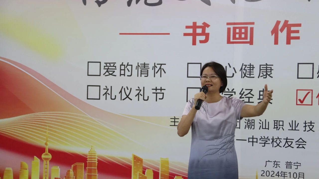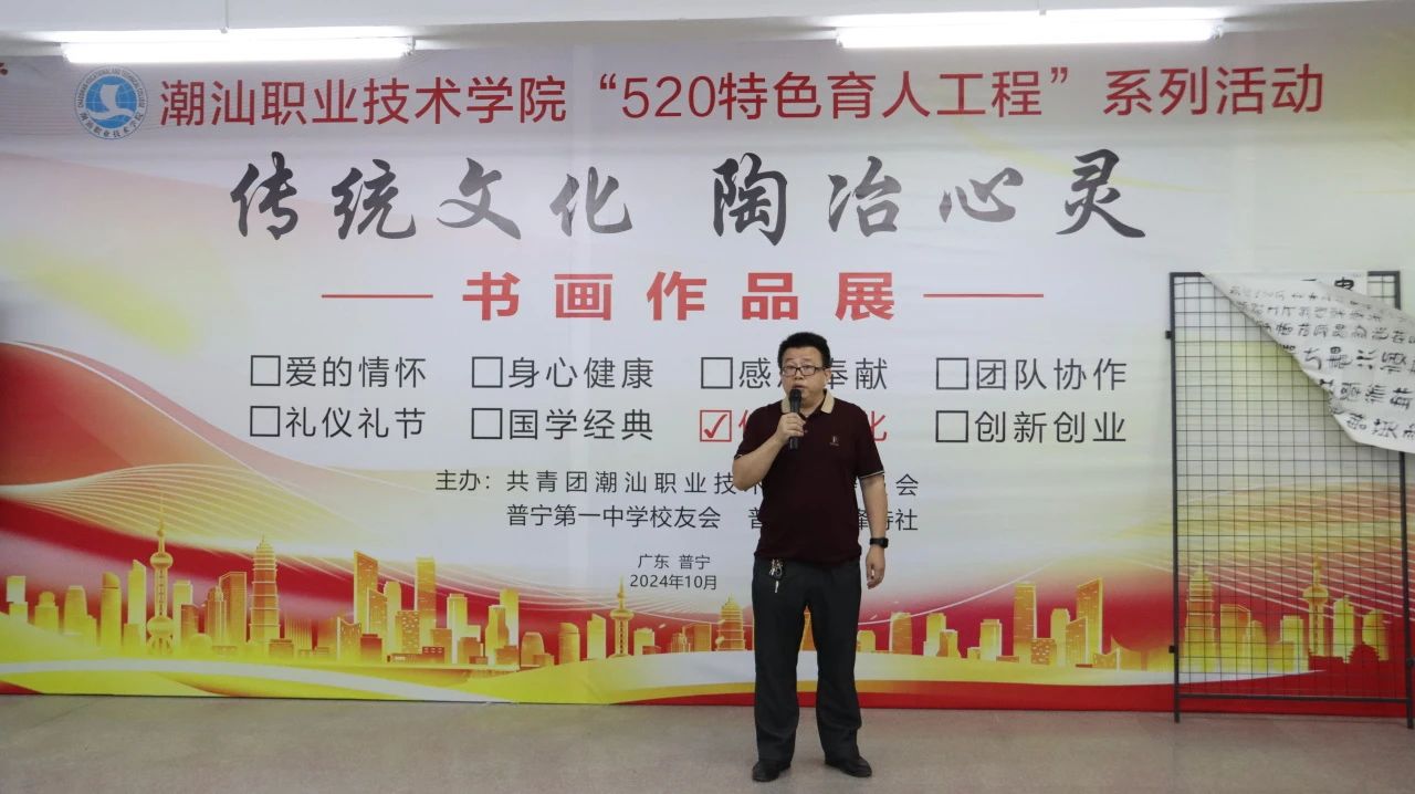 10月12日下午,由潮汕职业技术学院(以下简称“潮汕学院”)、普宁市第一中学校友会、普宁市铁峰诗社联合主办的“传统文化 陶冶心灵”书画作品展开幕式在潮汕学院举行。