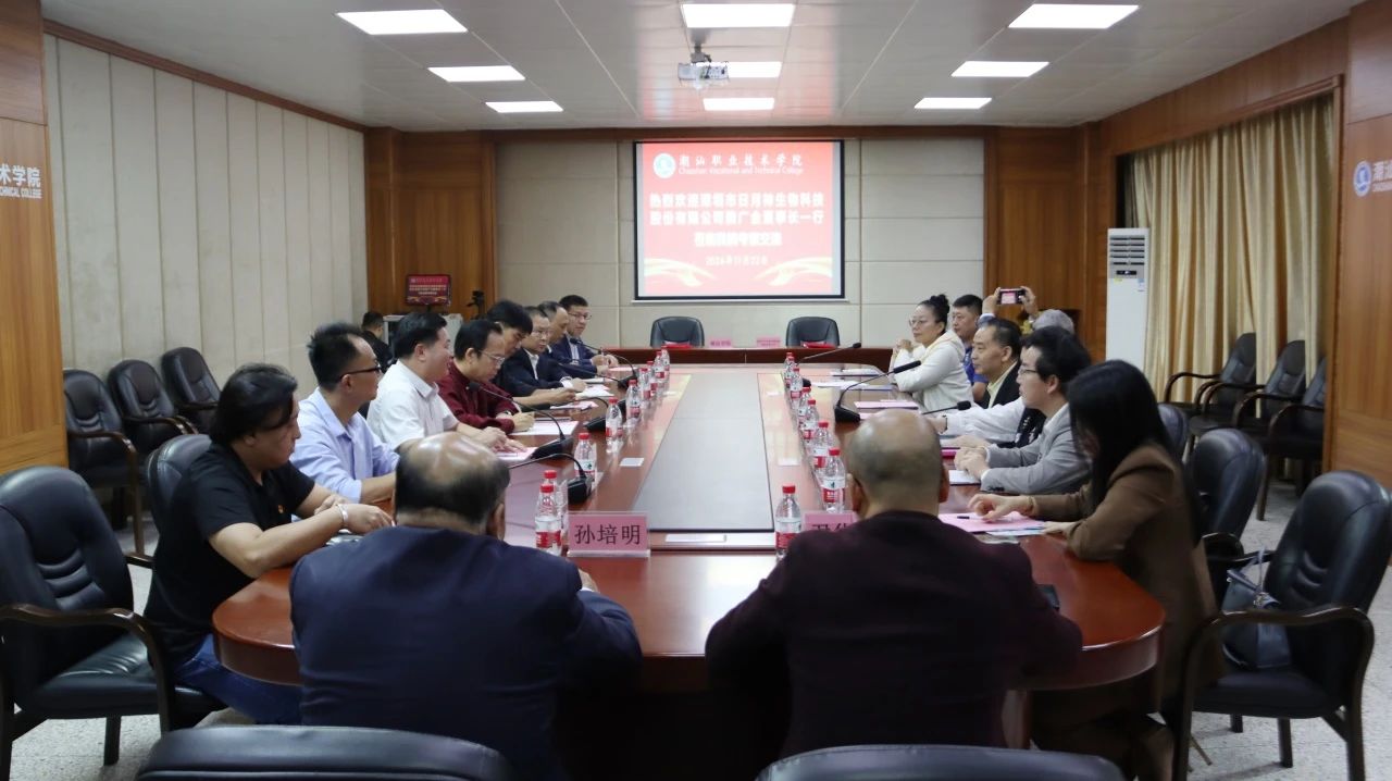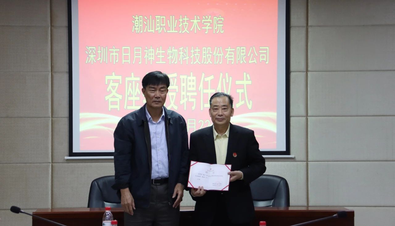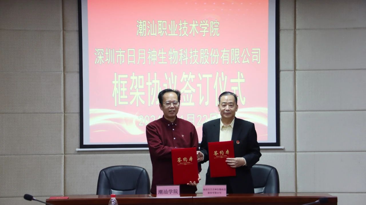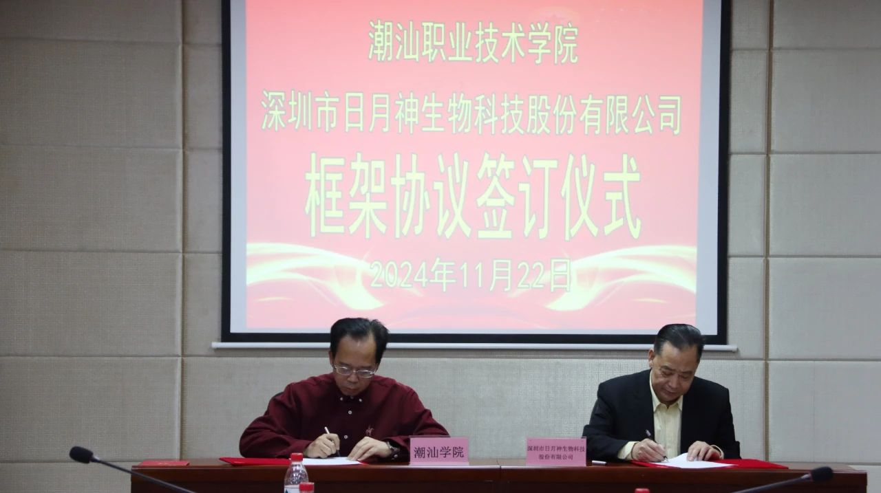 11月22日,潮汕职业技术学院(以下简称“潮汕学院”)与深圳市日月神生物科技股份有限公司签署大健康合作协议。协议由潮汕学院董事长纪少游先生与深圳市日月神生物科技股份有限公司董事长殷广全先生共同签署。