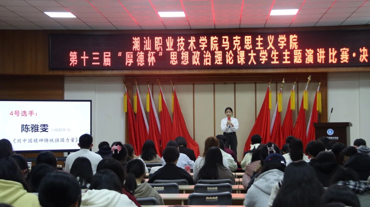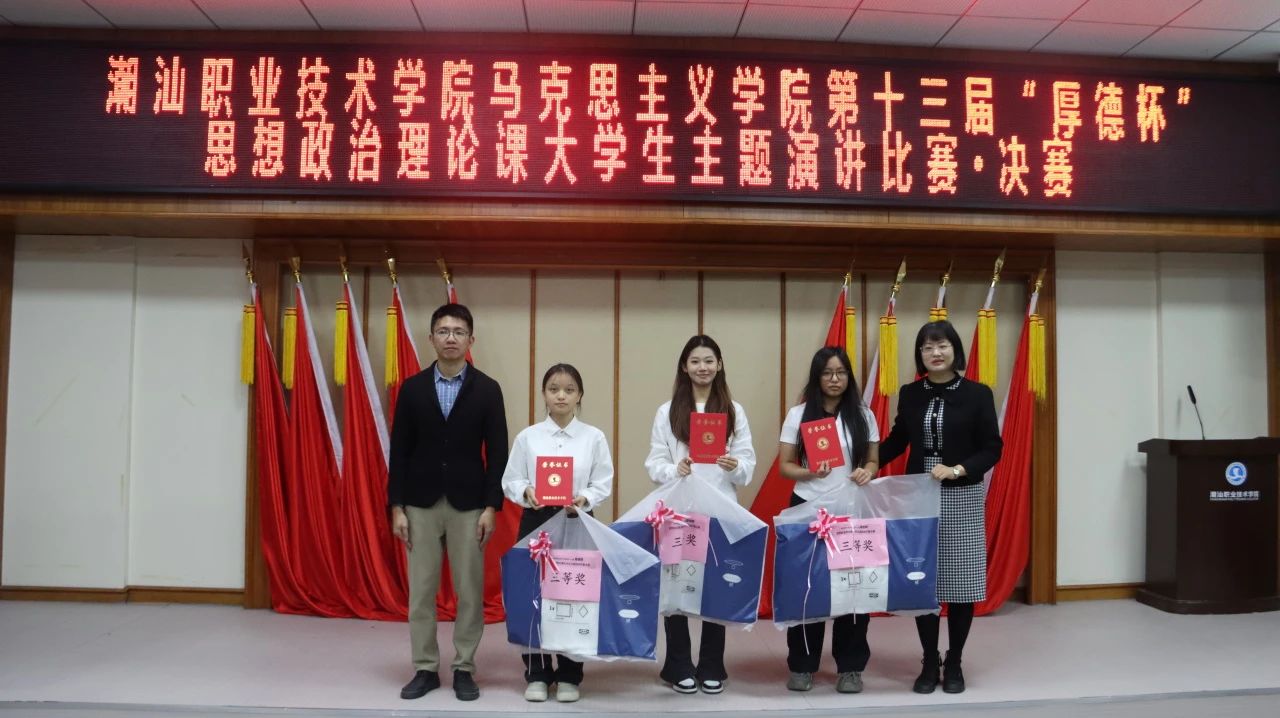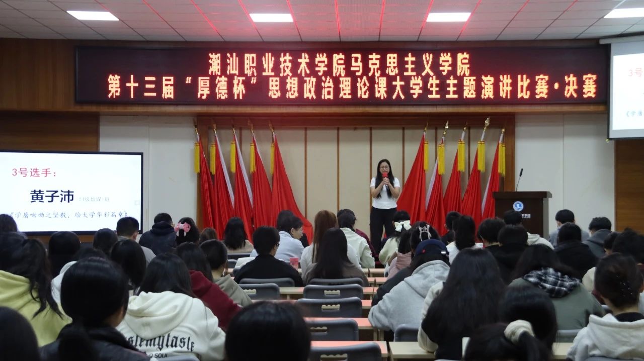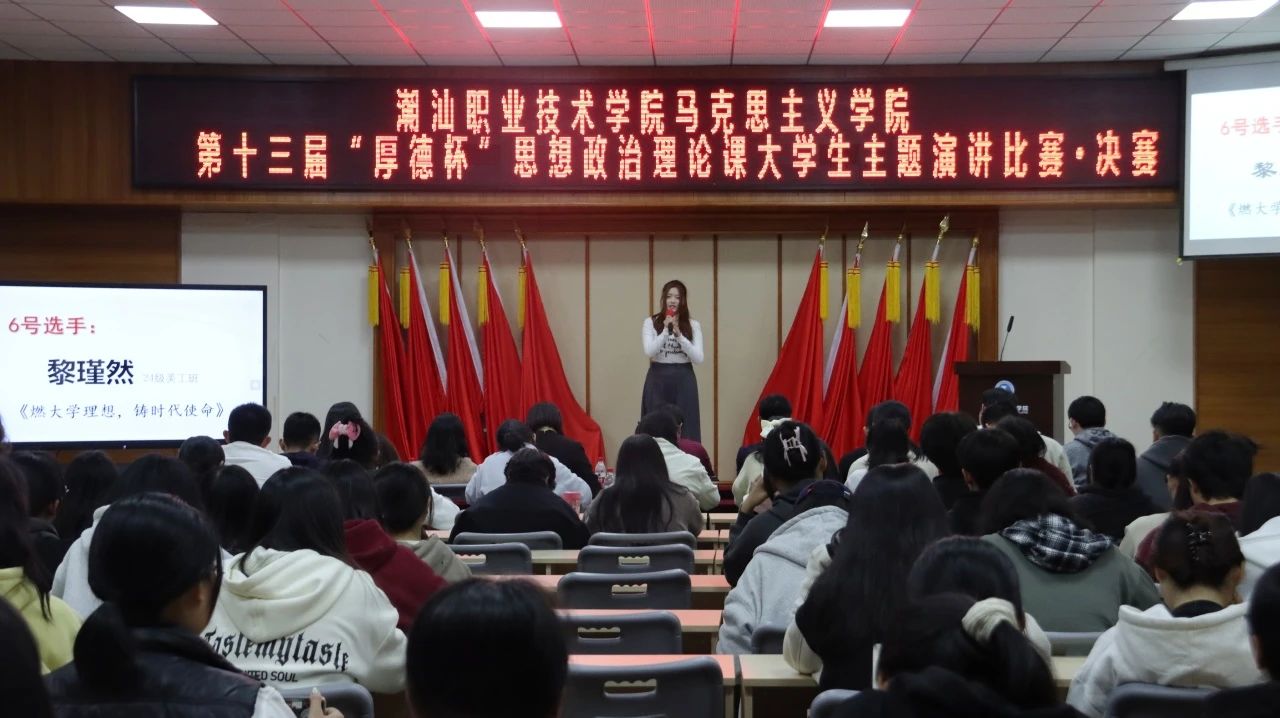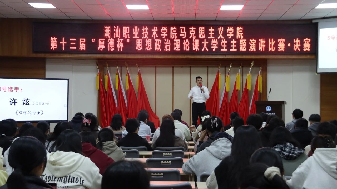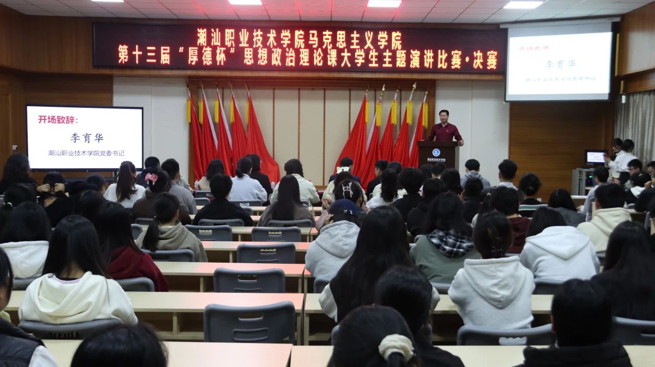 12月20日下午,作为《思想道德与法治》课程的教学实践环节,潮汕职业技术学院马克思主义学院第十三届“厚德杯”思想政治理论课大学生主题演讲比赛决赛在第二报告厅举行。
