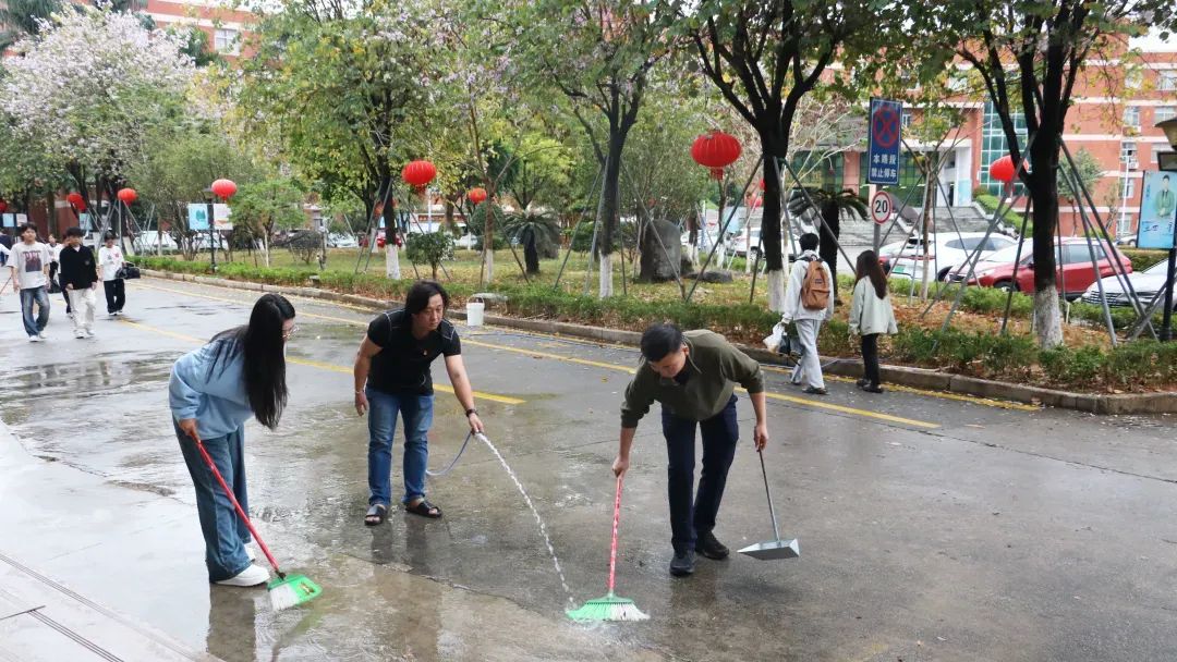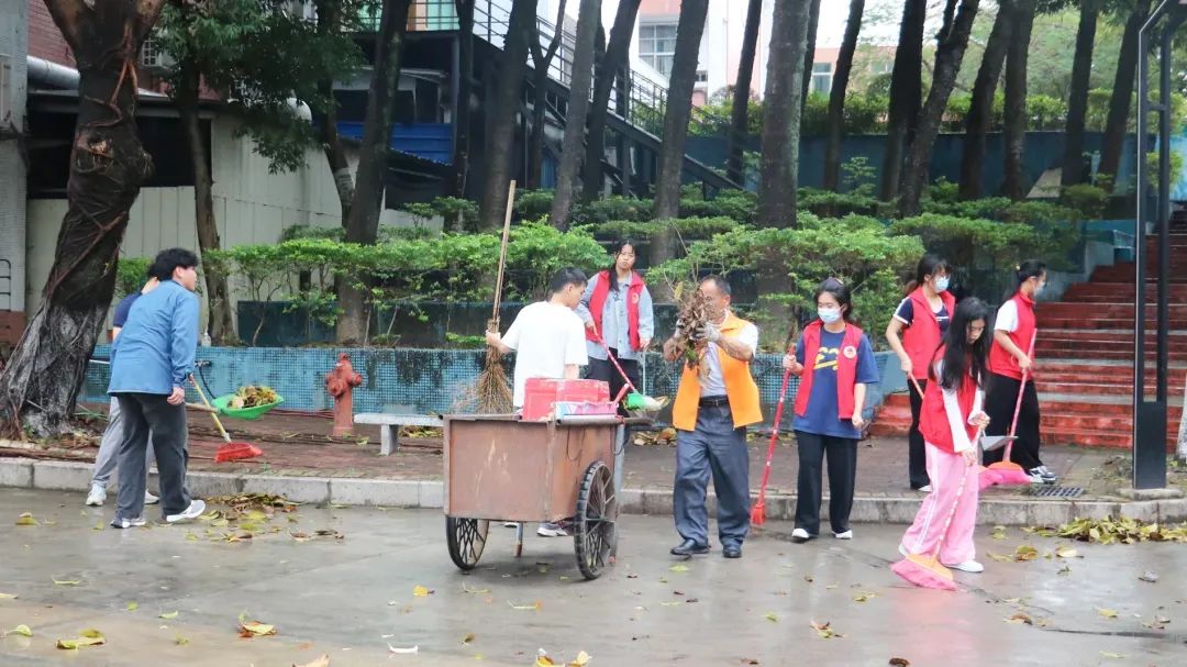 师生党员们分组行动,手持清洁工具深入潮韵广场、文化长廊、教学楼、校道、运动场、食堂、师生宿舍楼等区域,清扫路面落叶、擦拭公共设施、清理卫生死角。劳动过程中,党员师生们分工协作,干劲十足,充分展现了不怕脏、不怕累的奉献精神。经过集中清理,校园环境焕然一新,师生们的劳动成果获得来往师生的频频点赞。
